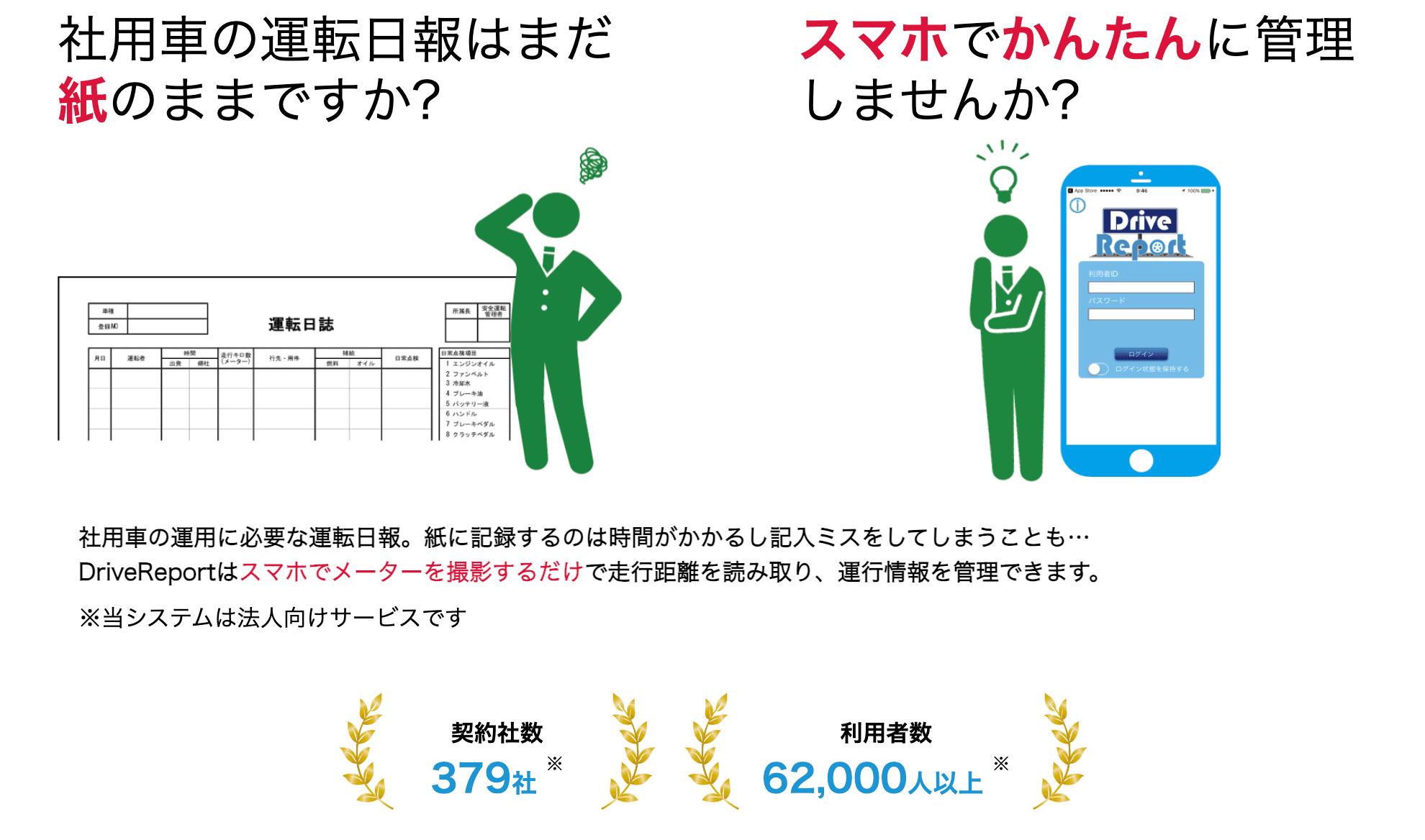 | DriveReport | 要見積もり | 330円/台 | スマホで簡単に走行距離を記録 初期コストがゼロ |