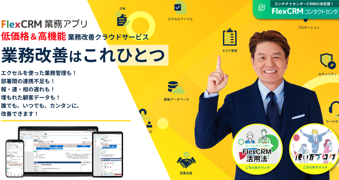 | FlexCRM | 初期費用:無料 月額1,200円/人 | 低価格・簡単・高機能に業務改善が可能 |