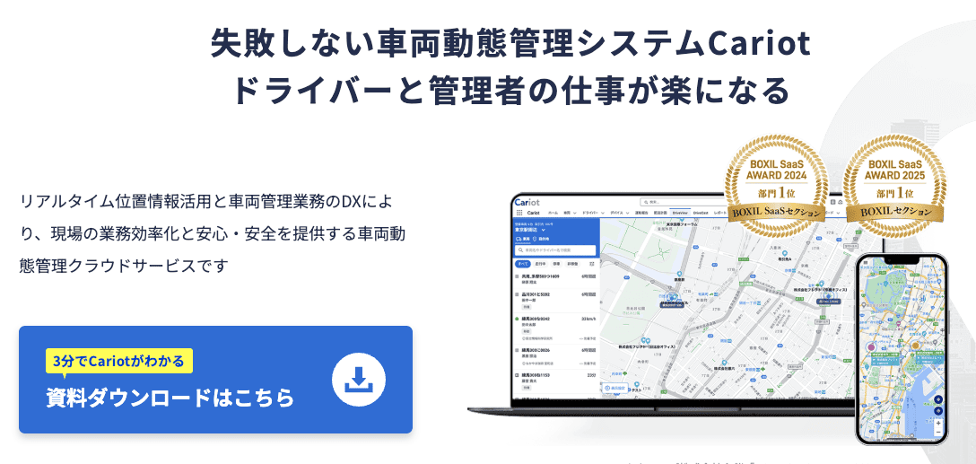 Cariot(キャリオット)は、物流やフィールドサービスなど、現場の動的な状況把握が求められる業務に特化した車両管理システムです。