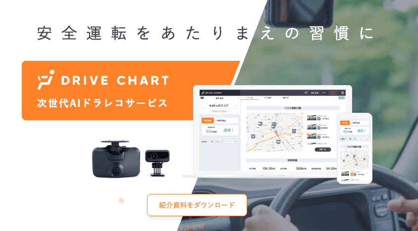 DRIVE CHARTは、高度なAI(画像認識技術)を搭載した通信型ドライブレコーダーを活用し、交通事故を未然に防ぐことに特化した次世代の車両管理システムです。